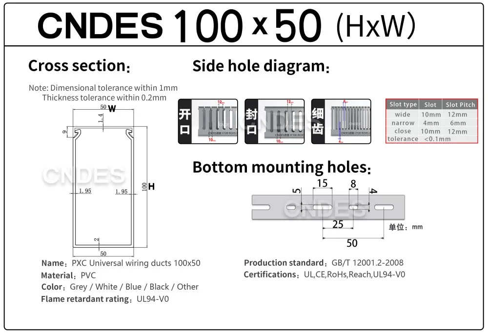 ЦНДЕС-ов прилагођени 100×50 ПВЦ кабловски канал је практично и ефикасно решење за управљање кабловима. Развили смо ову величину носача каблова како бисмо уравнотежили капацитет, флексибилност и исплативост, што га чини једним од најчешће коришћених модела у разводним плочама, комерцијалним зградама и индустријским објектима.