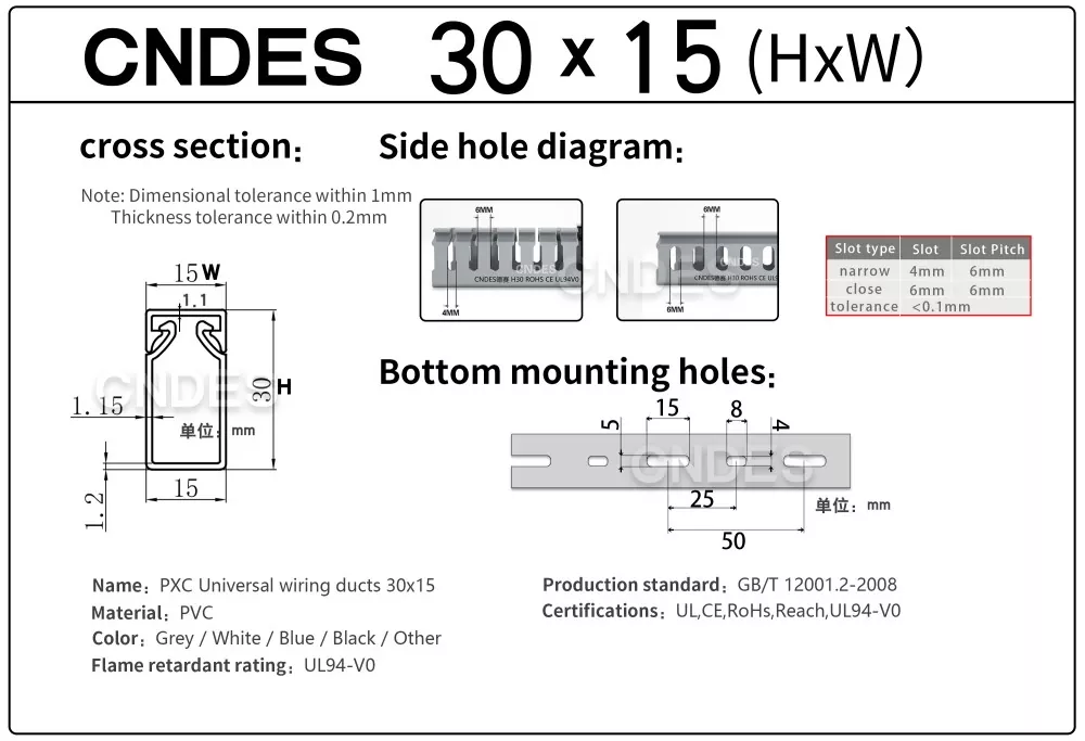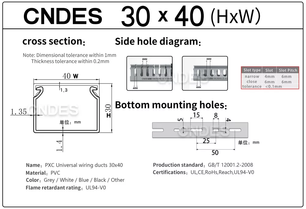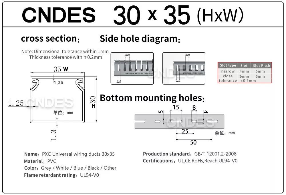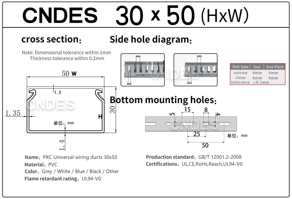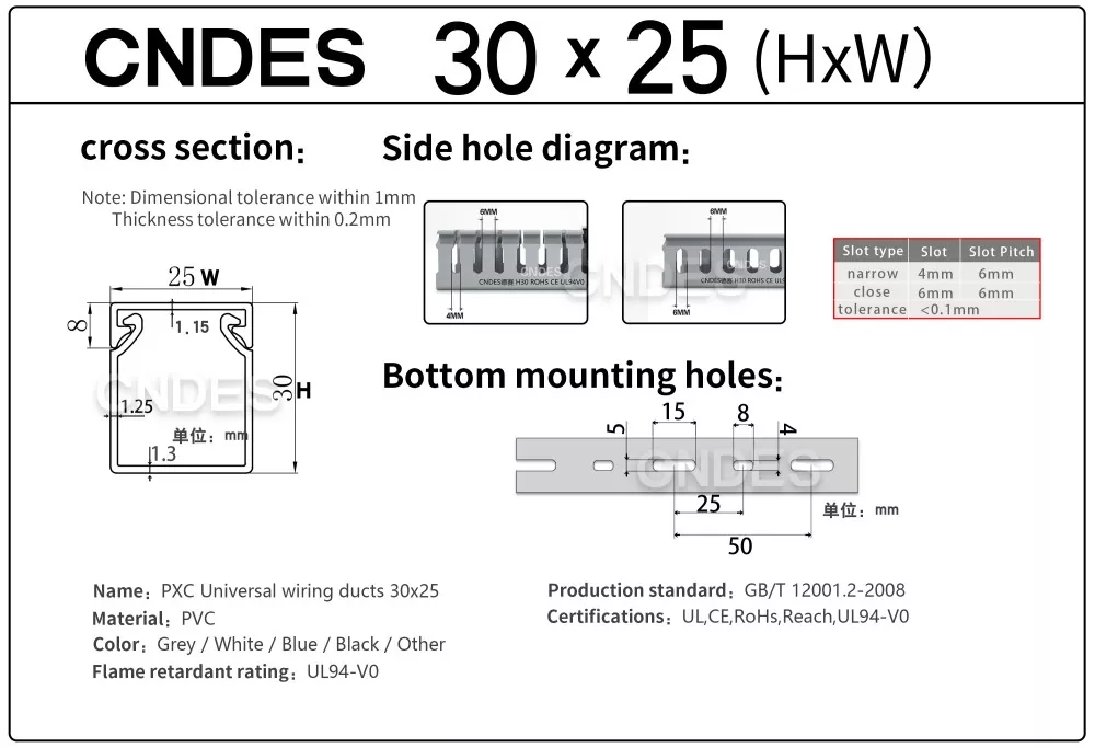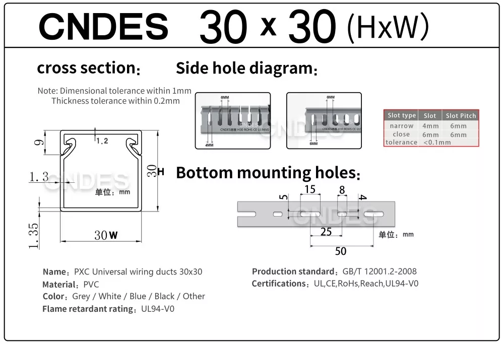 Укључује информације као што су дебљина, димензије и бушење нашег квалитетног ПВЦ канала за управљање кабловима са прорезима од 30 мм.