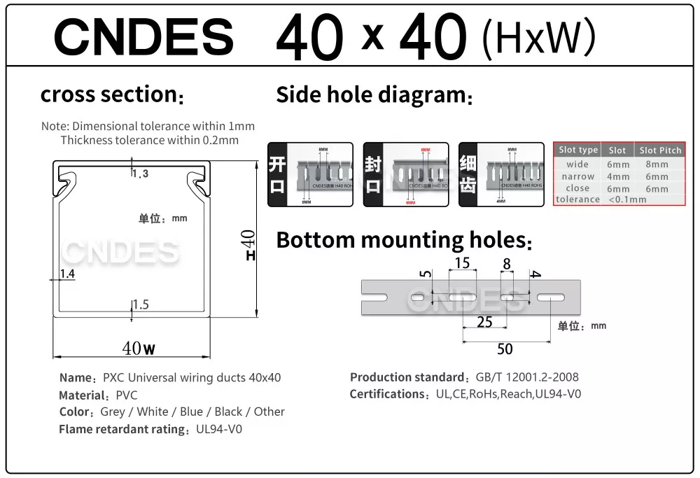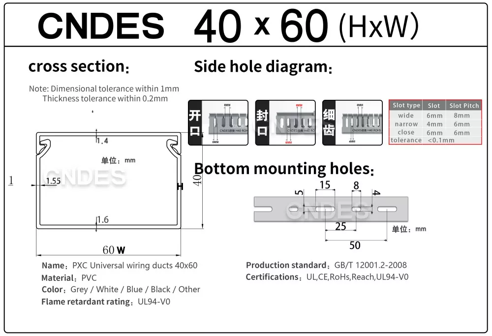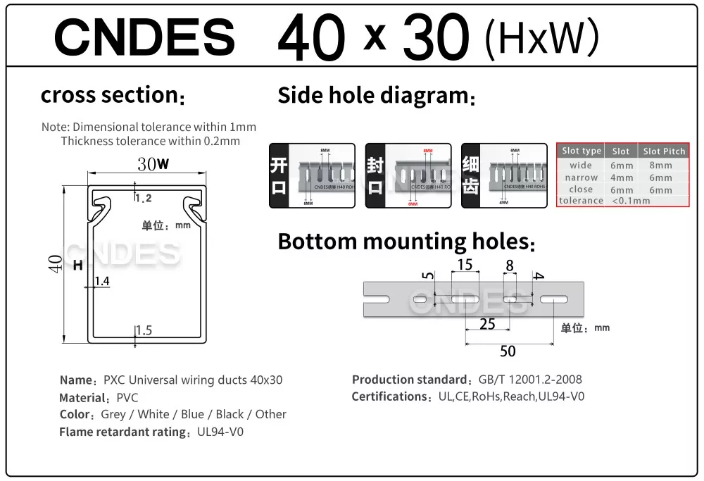 ЦНДЕС је водећи произвођач и добављач кабловских канала од ПВЦ-а са прорезима. Овде ћемо представити наше носаче каблова висине 40 мм, укључујући 40*25, 40*30, 40*35, 40*40 и 40*60.