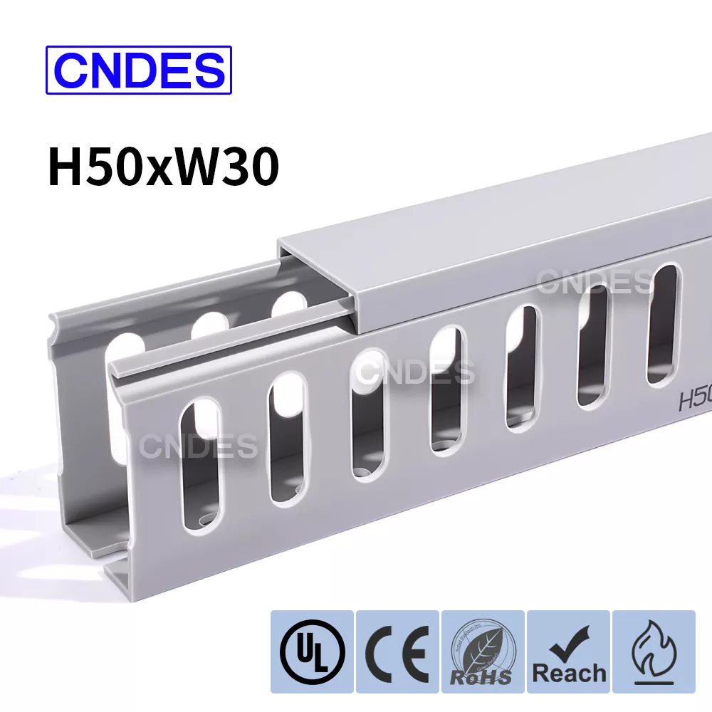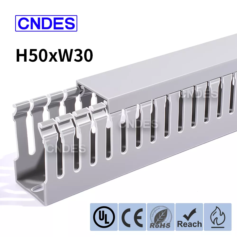 Квалитетан ПВЦ канал за организацију каблова са прорезима 50×30 компаније ЦНДЕС је компактно, ефикасно решење за управљање кабловима у уским просторима, као што су мали контролни ормари, кућишта података и разводне кутије опреме. Овај танки канал за ожичење омогућава инсталатерима да организују, одвоје и заштите каблове без заузимања превеликог простора на панелу.