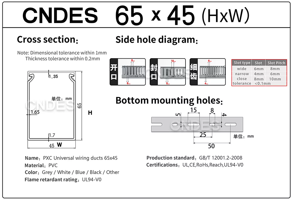 ЦНДЕС нуди велепродајне ПВЦ канале за ожичење 65×45 сивих прореза директно од произвођача. Доступне у дужинама до 2 метра, исечене или спојене према специфичним потребама. Сива (стандардна боја РАЛ 7030) се добро уклапа у индустријско окружење; неки производи нуде и белу, црну и друге боје. Сиви ПВЦ носачи каблова са прорезима подржавају ласерско гравирање или означавање за лако сортирање и управљање кабловима.