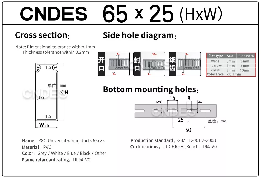 ЦНДЕС је фабрика извора канала за ПВЦ каблове са 24 године искуства. Прилагођени ПВЦ индустријски канал за ожичење са прорезима висине 65 мм је идеално решење за организовање и заштиту ожичења у окружењима велике густине као што су индустријске контролне табле, опрема за аутоматизацију и машинске инсталације. Са висином од 65 мм, нуди довољно простора за смештај већих снопова каблова док истовремено обезбеђује оптималну заштиту од фактора околине као што су прашина, влага и механичка оштећења.
