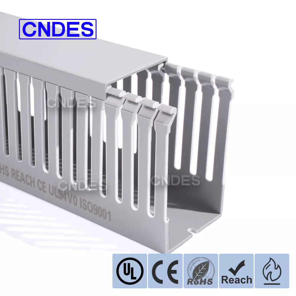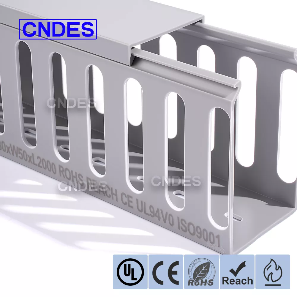 ЦНДЕС је професионални произвођач ПВЦ носача каблова са прорезима који се налазе у Кини. Овде ћемо представити наш 80×50 прорезни ПВЦ панелни организатор каблова, где 80*50мм представља носач каблова висине 80мм и ширине 50мм.