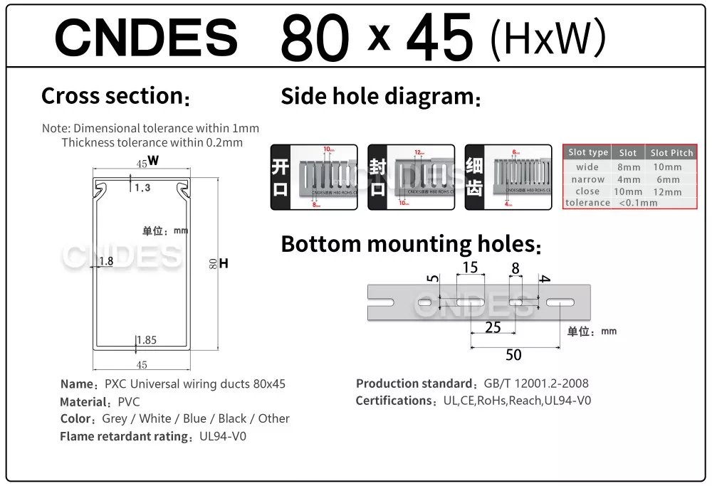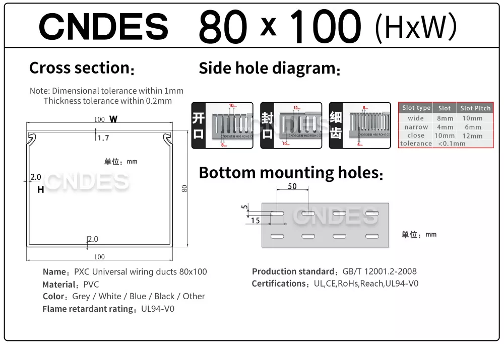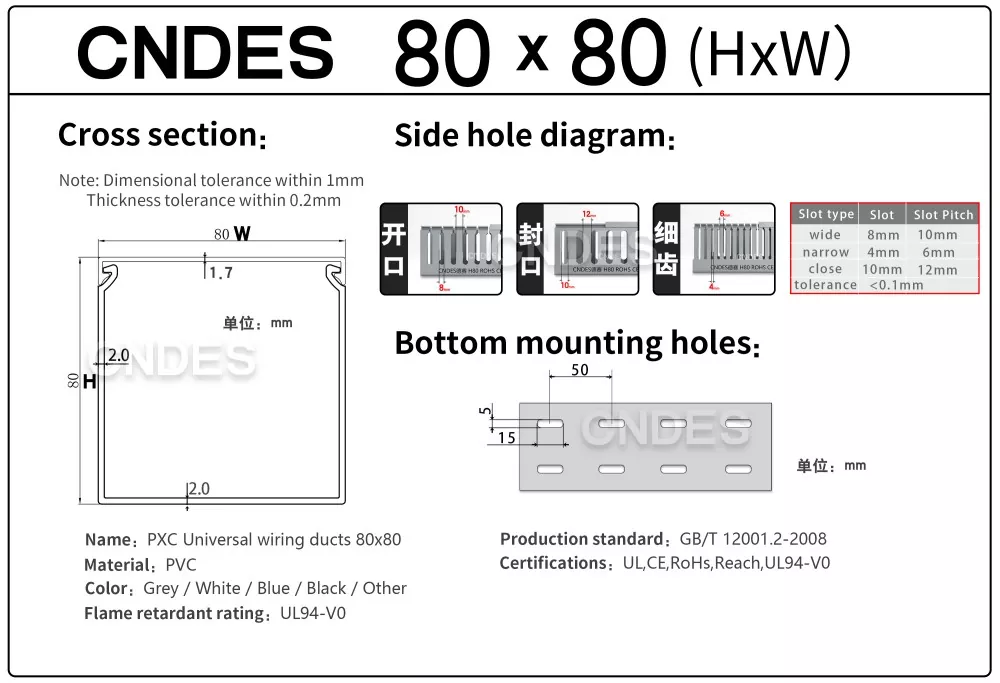 Прилагођени ПВЦ кабловски канал са прорезима од 80 висине од ЦНДЕС-а је пројектован за ефикасно управљање кабловима у системима индустријске аутоматизације. Са својом висином од 80 мм и дизајном са прорезима, овај канал пружа довољно простора за ожичење високе густине, док одржава каблове организованим и заштићеним у сложеним контролним системима, ПЛЦ-овима и апликацијама за ожичење машина.