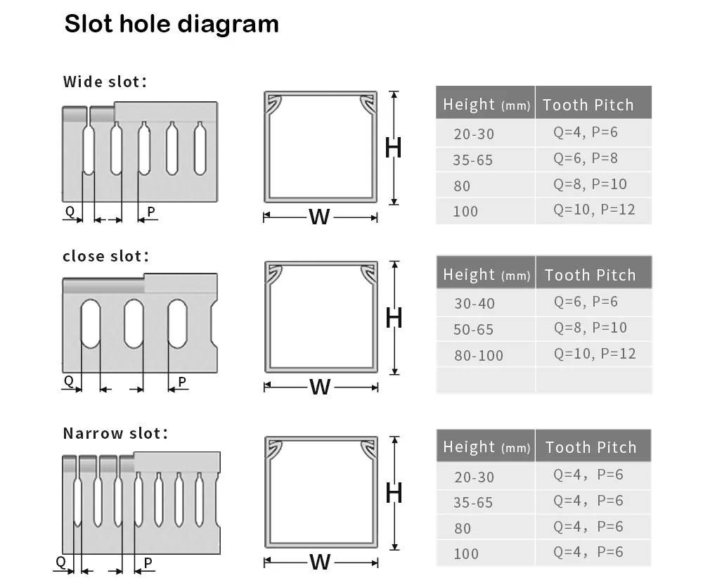 Спецификације канала за ожичење мере се у милиметрима и изражавају као висина × ширина (на пример, 80 × 50 мм). Започните мерењем расположивог простора за инсталацију и пречника и количине ваших каблова. Затим изаберите одговарајући профил утора: широки прорез (8 мм) је идеалан за дебље каблове, док је уски прорез (4 мм) бољи за тање каблове и организованије ожичење. За оптималне перформансе и расипање топлоте, препоручујемо да укупна запремина кабла буде унутар 70% капацитета канала.